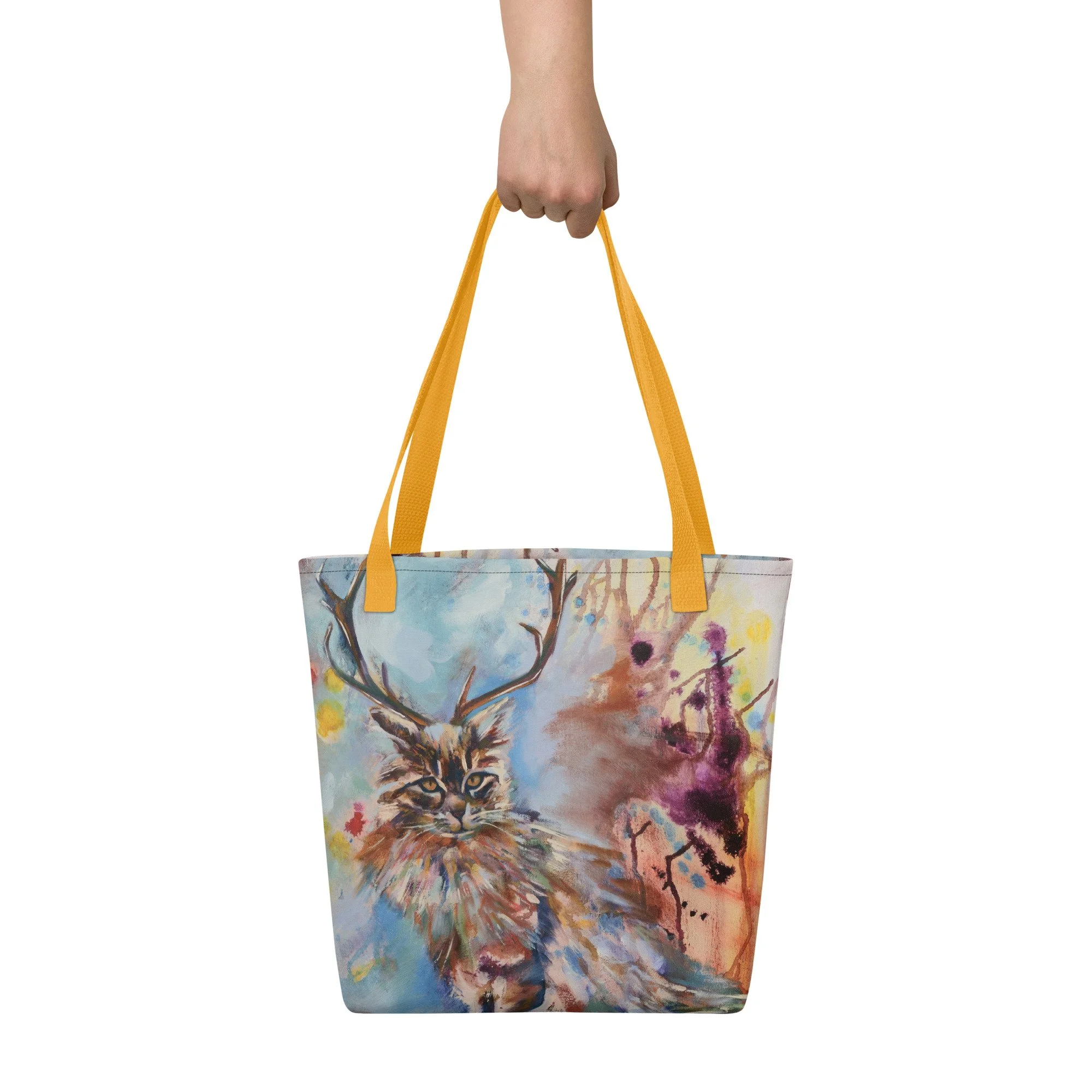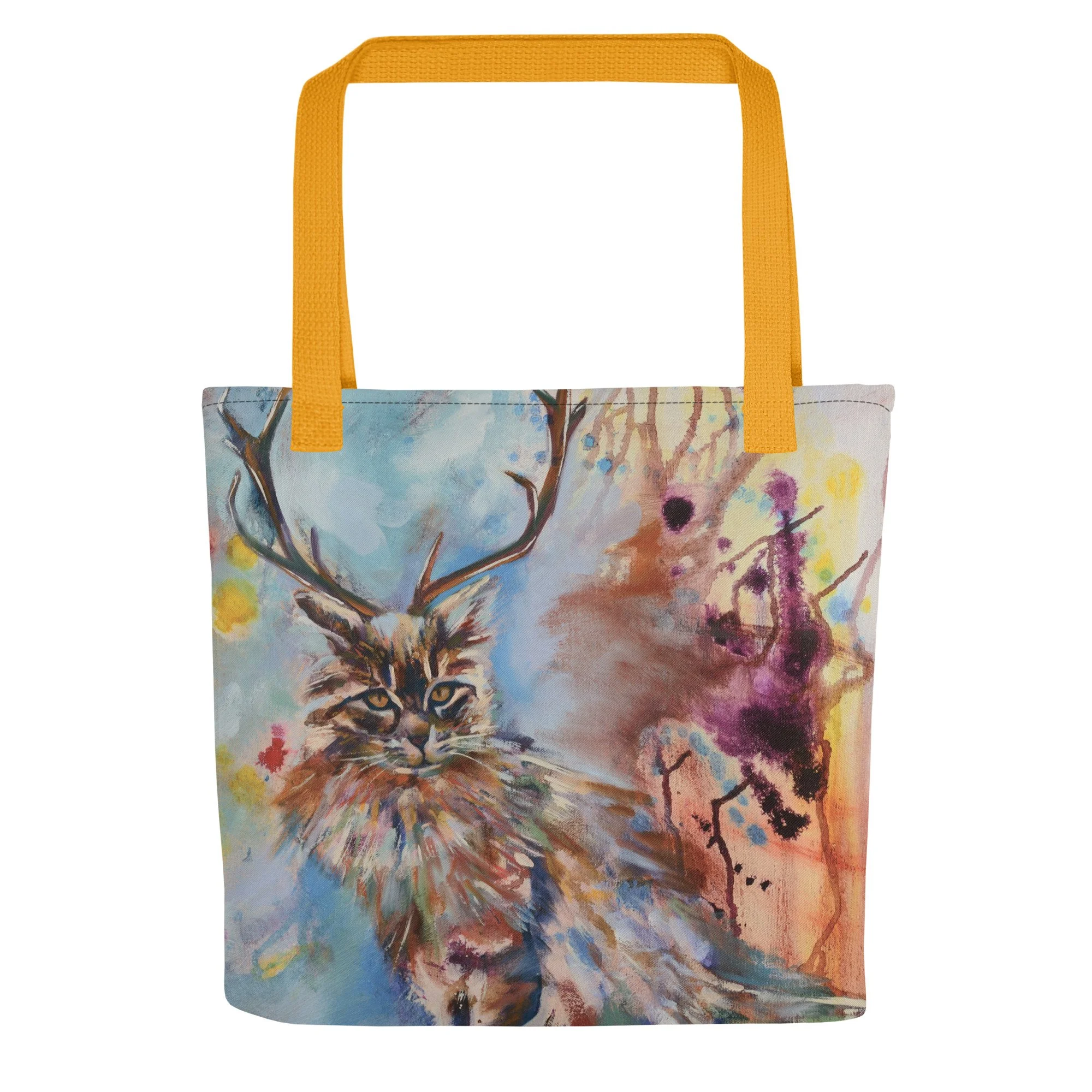 A spacious tote bag to help you carry around everything that matters. With the most adorable kitty with antlers. She's all dressed up and ready to play. And so should you. Go grab your stuff and head out to play! Who knows what the day will bring!